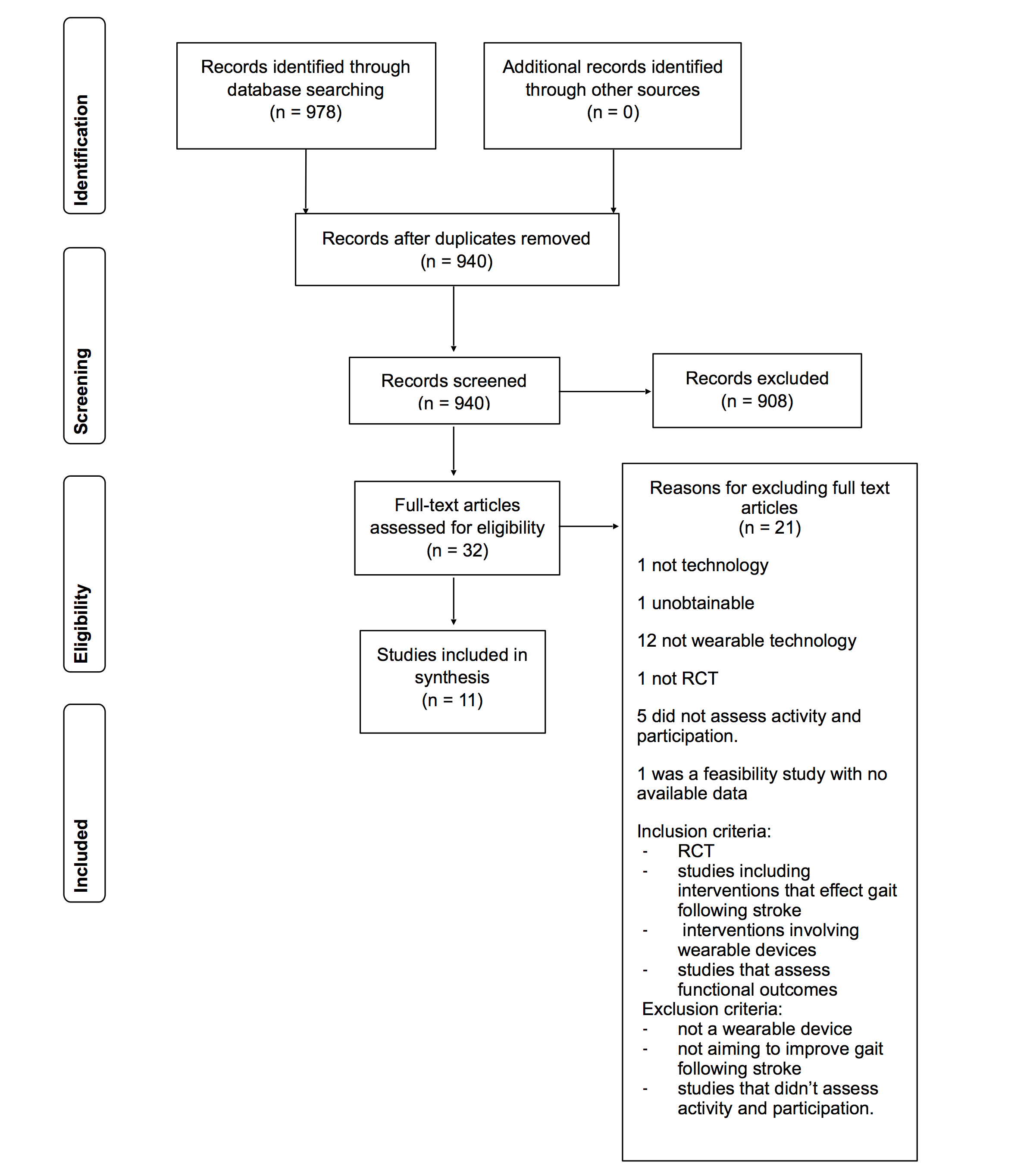 Methods: Randomized controlled trials (RCTs) of lower limb wearable technology for poststroke rehabilitation were included. Primary outcome measures were validated measures of activity and participation as defined by the International Classification of Functioning, Disability and Health. Databases searched were MEDLINE, Web of Science (Core collection), CINAHL, and the Cochrane Library. The Cochrane Risk of Bias Tool was used to assess the methodological quality of the RCTs.
